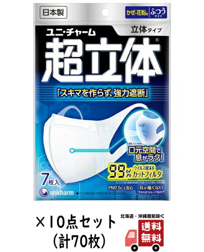 【送料無料・まとめ買い×10】ユニチャーム 超立体マスク ふつうサイズ 7枚入×10点セット かぜ・花粉用 日本製 (使い捨て不織布マスク) ( 4903111901937 )※パッケージ変更の場合あり