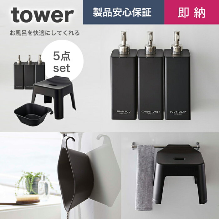 山崎実業 tower お風呂を快適にしてくれるセット マグネットツーウェイディスペンサー 風呂イス 湯おけ タワー ブラック [5点セット] 【マグネットツーウェイディスペンサー 引っ掛け風呂イス 引っ掛け湯おけ バスチェア 洗面器 山崎実業 yamazaki タワーシリーズ】