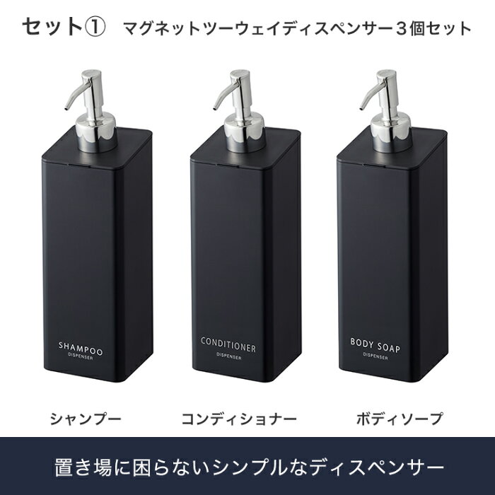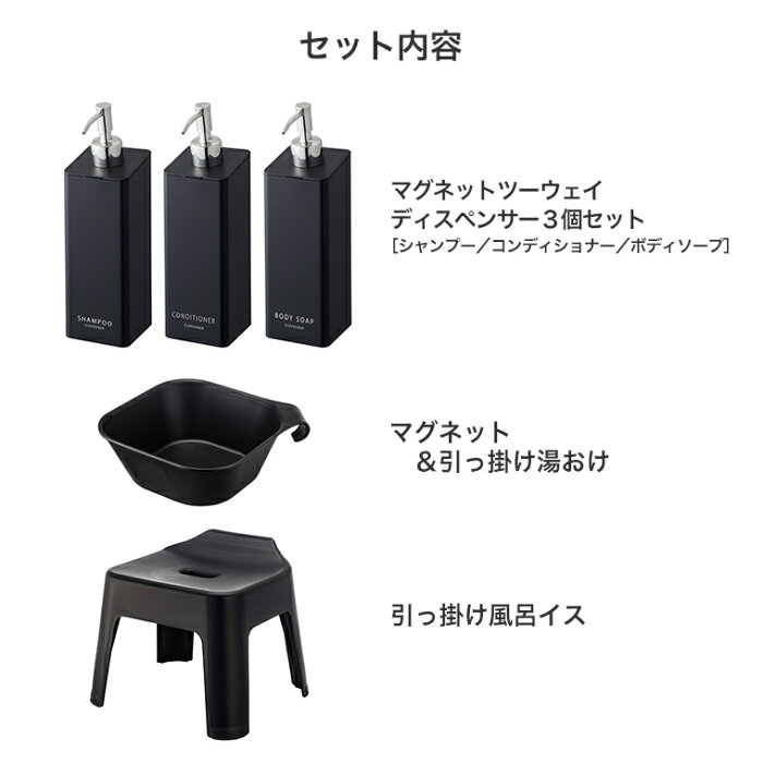 よく一緒に購入されている商品山崎実業 tower (タワー) マグネットツ1,980円山崎実業 tower ツーウェイマスク収納ケー3,960円山崎実業 MIST 詰め替え用ランドリーボトル2,750円 セット詳細■セット内容 ・マグネットツーウェイディスペンサー3個セット ・引っ掛け風呂イス ・マグネット&引っ掛け湯おけ ーーーーーーーーーーーーーーーーーーーー 【マグネットツーウェイディスペンサー】 3個セット(シャンプー・コンディショナー・ボディーソープ) ■サイズ:約 7×9×24cm ■容量:約500ml ■重量:約305g ■材質 容器・蓋:ABS樹脂 マグネット パッキン・滑り止め:シリコーン ポンプ:ステンレス パイプ:ポリエチレン ■耐荷重:約1kg ■対応サイズ 詰め替え用パック:400ml 以内のもの 取り付け可能な壁面 磁石が付く平らな面・スチール壁面 【引っ掛け風呂イス】 ■サイズ:約 幅34 × 奥行32 × 高さ29cm(座面の高さ約25cm) ■重量:約 985g ■材質 本体:ポリプロピレン、滑り止め:エラストマー ■耐荷重:約 100kg ■耐熱:約 150度/-40度 ■備考 パイプの直径:約3cm以下・シャワーフックの直径:約2.5cm以上のものに引っ掛け可能 【マグネット&引っ掛け湯おけ】 ■サイズ:約 幅29.5 × 奥行27 × 高さ9cm ■重量:約 263g ■材質 本体:ポリプロピレン、マグネット ■容量:約 2.5L ■耐熱:約 170度/-40度 ■備考 フック:パイプの直径:約3cm以下・シャワーフックの直径:約2.5cm以上のものに引っ掛け可能、マグネット:マグネットが付く壁面特徴■マグネットツーウェイディスペンサー マグネットがつく面ならどこでも設置可能。