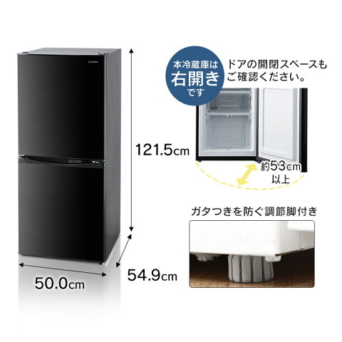 ■種類ノンフロン冷凍冷蔵庫■冷媒R600a■ドア数2■ドア開閉方向右開き■商品サイズ(cm)幅約50.0×奥行約54.9×高さ約121.5■質量約40kg■定格電源AC100V 50Hz/60Hz■定格内容積※1全体:142L冷蔵室:90L冷凍室:52L■冷凍室の性能※2記号:フォースター冷凍負荷温度(食品温度):-18℃以下冷凍食品の保存期間の目安:約3か月■年間消費電力量※3259kWh/年■電動機の定格入力49/56W■電熱装置の定格入力8W■省エネ基準達成率103%■電源コード長約1.8m■主要材質鋼板、PS、銅、ガラス等■付属品製氷皿、玉子トレー■カラーホワイト・ブラック・シルバー※商品の仕様は予告なく変更することがあります。